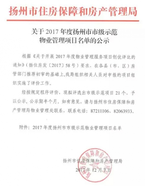 12月7日,揚州市住房保障和房產(chǎn)管理局下發(fā)《關(guān)于2017年度揚州市市級示范物業(yè)管理項目名單的公告》,愛濤物業(yè)在管項目中江都區(qū)行政中心和春暉人家小區(qū)被評為“市級示范物業(yè)管理項目”。